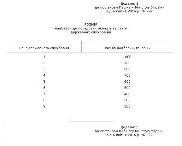 Згідно з документом, держслужбовець 1-го рангу отримуватиме надбавку до посадового окладу в розмірі 1 тис. гривень. Далі з кожним зниженням рангу сума надбавки зменшуватиметься на 100 грн.