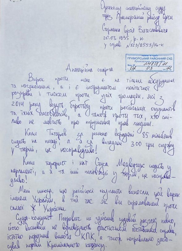 Громадський діяч Сергій Стерненко подав апеляційну скаргу на рішення Приморського районного суду міста Одеси, який оголосив йому тюремний вирок. Про це повідомила Facebook-сторінка активіста в п'ятницю.