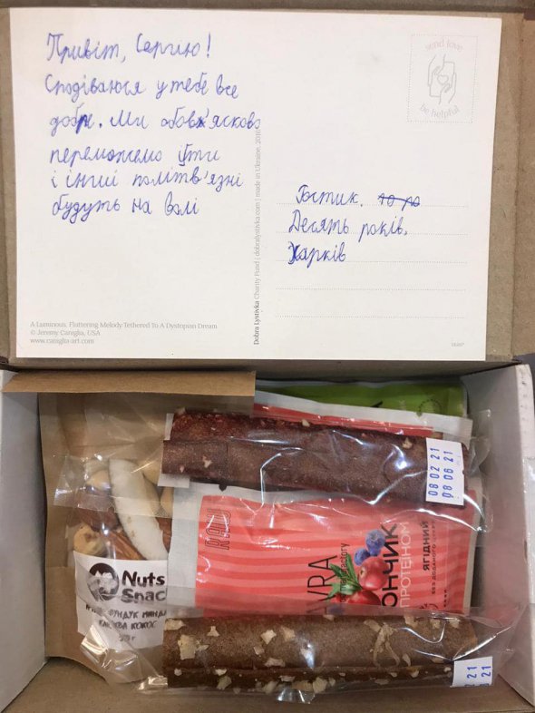 "Привіт, Сергію! Сподіваюся у тебе все добре. Ми обов'язково переможемо, і ти й інші політв'язні будуть на волі. Ростик. 10 років. Харків", - написано на листівці.