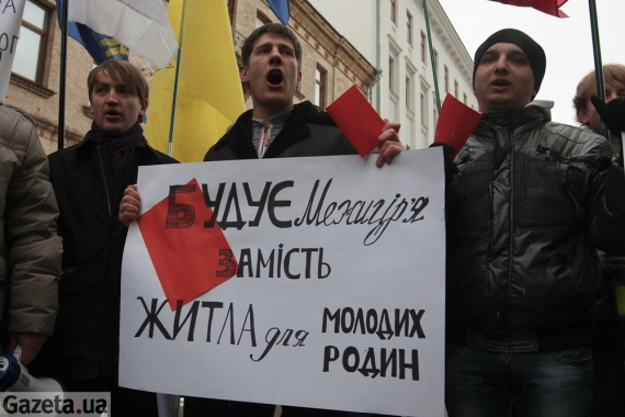Молоді активісти із партії ВО "Свобода", партії "Батьківщина", "УДАРу", "Фронту Змін" та "Народного руху" тримали червоні картки, які символізують недовіру президенту. Також вони тримали плакати: "Будую Межигір'я замість доступного житла для молоді", "Тотальна українофобія замість розвитку освіти", "Фінансує "тушок" замість підвищення стипендій".
