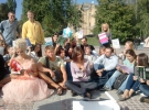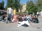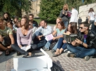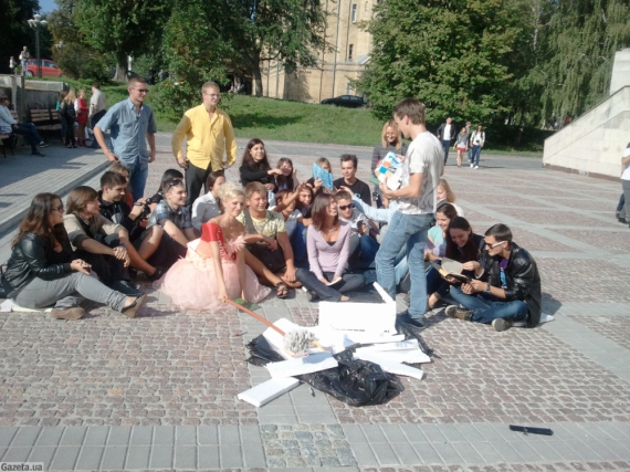 На Площі знань, на території КПІ, сьогодні пройшли урочистості з нагоди "Дня першокурсника". Після його завершення, коли кілька тисяч студентів та їх батьків розійшлись по корпусам, пару десятків молодих людей сіли посеред площі та поставили перед собою імпровізований телевізор. Молоді люди кілька хвилин просиділи, "перемикаючи канали", а потім одна із учасниць почала бити шваброю по телевізору.