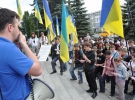 Під час мітингу молодь розтягнула на сходовому майданчику перед обладміністрацією великий жовто-блакитний прапор.