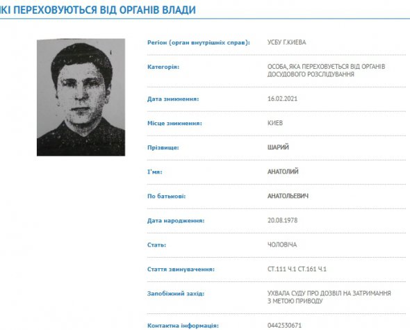 Шарій також з'явився в розшукових обліках МВС, як особа, що переховується від слідства з 16 лютого 2021 року.