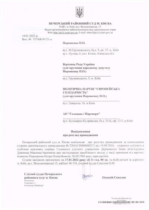 Печерський районний суд міста Києва призначив судове засідання в кримінальній справі щодо п'ятого президента й народного депутата Петра Порошенка.