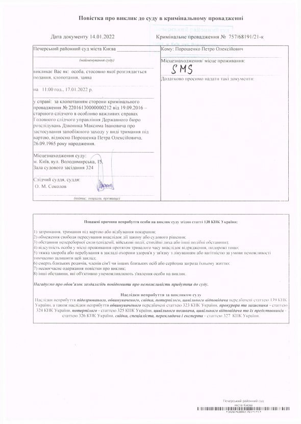 "17 січня 2022 року об 11:00 розглянуть клопотання про обрання запобіжного заходу у вигляді тримання під вартою щодо Порошенка Петра Олексійовича", - повідомило ДБР.
