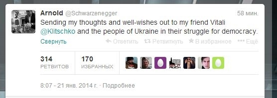 "Шлю свої думки і добрі побажання моєму другу Віталію Кличку та українському народові в його боротьбі за демократію", - написав Шварценеггер в Твіттері.
