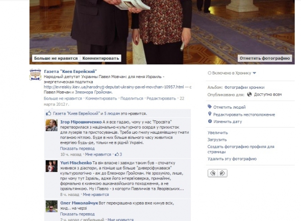 Політик залишив відповідний коментар під фотографією з альбому медіа-проекту "Київ єврейський", на якій відображені Павло Мовчан та головний редактор видання Елеонора Гройсман. Під фотографією розміщене активне посилання на інтерв'ю політичного діяча, в якому він говорить, що поважає Ізраїль.