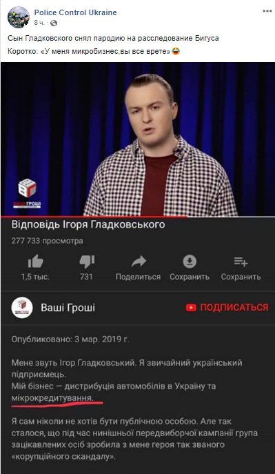 Для цього він зняв пародію на передачу "Наші гроші" з Денисом Бігусом. У відео Гладковський-молодший спочатку показує зелене полотно за собою, заявляючи, що з ним можна зробити будь-яку передачу фігурант корупційного скандалу називає себе чесним бізнесменом, який займається дистрибуцією авто до України і мікрокредитуванням. І пообіцяв, що дуже скоро всі дізнаються, "хто насправді зліпив цей фейк та злив його журналістам".