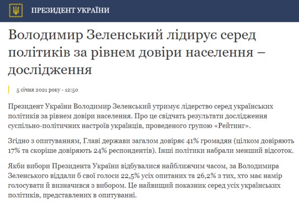 За даними групи "Рейтинг", президенту Зеленському не довіряють 54%. Однак про це на сайті президента не згадали.