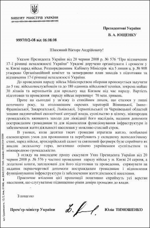 З огляду на це Тимошенко просить Ющенка скасувати свій указ у частині проведення параду військ у Києві 24 серпня, "а додаткові кошти, заплановані для його підготовки, спрямувати на надання першочергової допомоги постраждалим громадянам і відновлення функціонування інфраструктури із забезпечення життєдіяльності населення".
