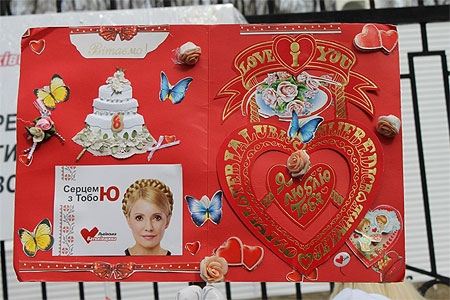 Нардепи принесли до залізних воріт лікарні величезне червоне серце з паперу. Прив'язали до повітряних кульок. Відпустили. Величезне серце пропливло як раз повз вікна на 9 поверсі, де знаходиться палата Тимошенко.