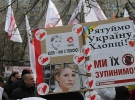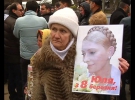 Жінки тримають у руках плакати. На них – Юлія Тимошенко із білими квітами.