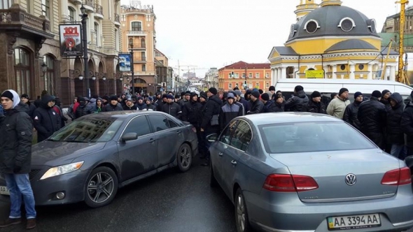 "Тітушки" загородили шлях Автомайдану на Поштовій площі", написав на своїй сторінці у Фейсбук активіст Євромайдану Віталій Уманець.