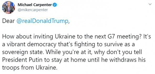 "Шановний Дональде Трамп, як щодо запрошення України на наступну зустріч G7? Це - яскравий приклад демократії, яка бореться за виживання як суверенна держава. Поки ви так налаштовані, чому ви не скажете президенту Путіну залишатися вдома, поки він не виведе свої війська з України", – написав Карпентер.