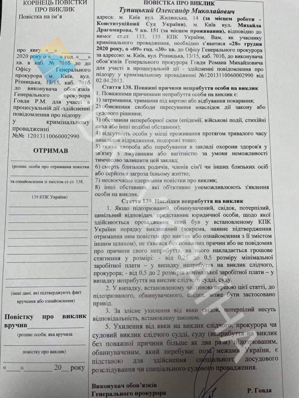 Тупицького просять прийти в Офіс генпрокурора 28 грудня для того, щоб йому повідомили про підозру у кримінальному провадженні.