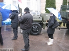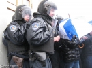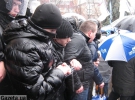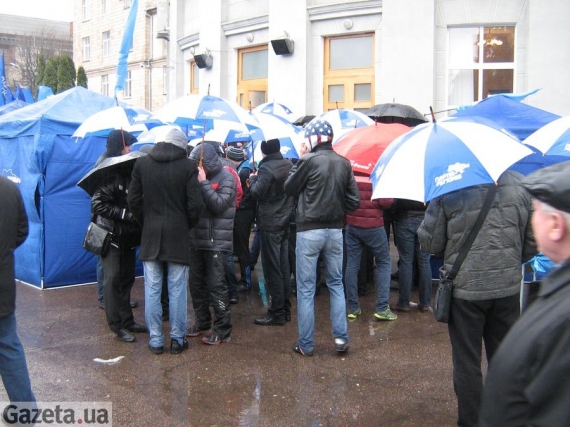 Вхід до будівлі перекрили хлопці спортивної статури з парасольками, де зображена символіка Партії регіонів, і спецпідрозділ міліції.
