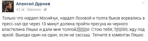 Сам Дурнєв написав на своїй сторінці у Фейсбук, що "люди Ляшка" увірвалися на його пресуху у почали його лупцювати.