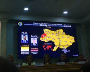 "Кількість голосів виборців поданих за кожного кандидата: Зеленський Володимир - 13 541 528 голосів, Порошенко Петро 4 522 450 голосів виборців. Відсоток голосів виборців поданий за кожного кандидата у відношенні голосів виборців, які взяли участь у голосуванні: Зеленський - 73,22%, Порошенко - 24,45%", - зачитала протокол голова комісії Тетяна Сліпачук.