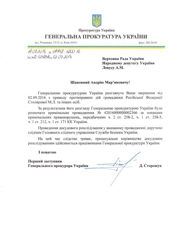 Відповідь ГПУ на запит виклав у Facebook нардеп Андрій Левус.