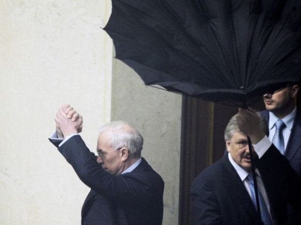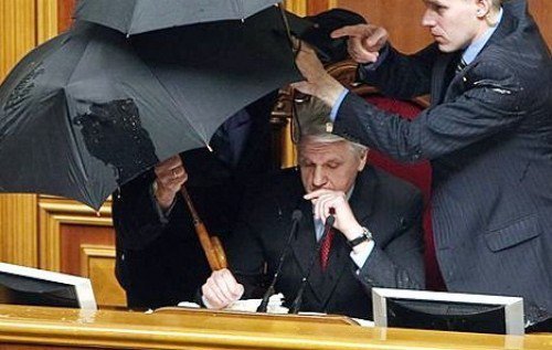 Коли до зали вийшов спікер Володимир Литвин, у нього полетіли яйця. Охоронці захистили главу ВР парасольками.