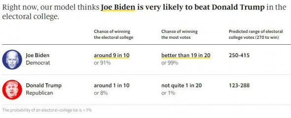 Станом на 27 липня у Байдена 9 з 10 шансів перемогти на президентських виборах у листопаді 2020 року. Водночас у Трампа - 1 шанс із 10.