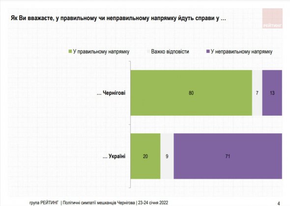 В цілому мешканці Чернігова значно краще оцінюють стан справ на місцевому рівні, аніж на загальнодержавному. Так, лише 20% опитаних вважають, що справи у країні йдуть у правильному напрямку, 71% – протилежної думки. Щодо міста – 80% вважають, що справи у ньому рухаються у правильному напрямку, лише 13% – навпаки.