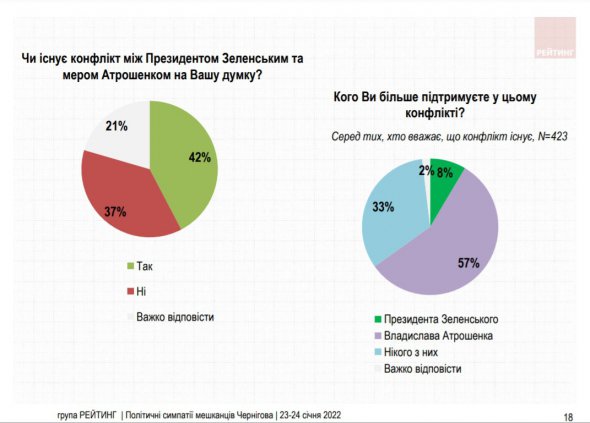 За даними соцопитування, 42% чернігівців переконані, що між президентом Володимиром Зеленським та мером Владиславом Атрошенком існує конфлікт. 37% думають, що його немає. Серед тих, хто вважає, що таке протистояння існує, 57% підтримують мера, 8% – Президента. Решта не підтримують нікого з них.