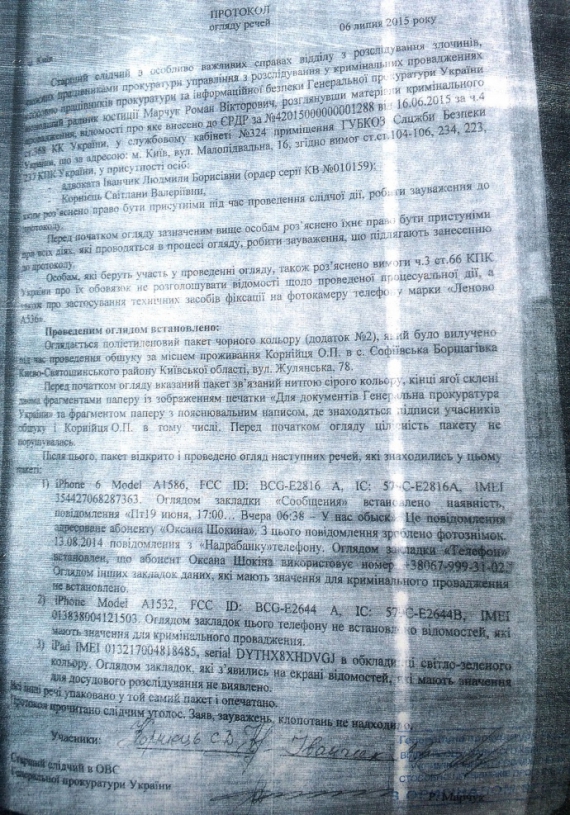 Окрім документів у пакеті знайшли телефон iPhone 6, який належить дружині прокурора Світлані Корнієць. Згідно з протоколом, у цьому телефоні було знайдено смс-повідомлення від 5 липня на адресу абонента, підписаного "Оксана Шокіна", зі словами "у нас обшук".