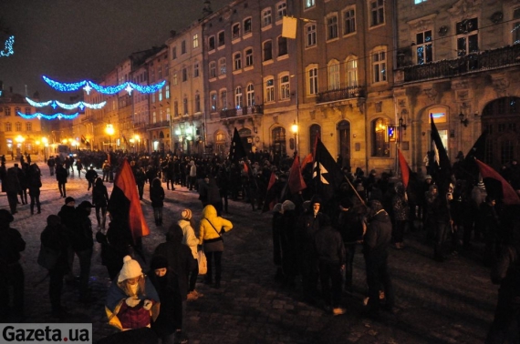 Біля львівської Ратуші зібралось близько 1500 людей, які прийшли вшанувати пам'ять героїв. Усім людям роздали смолоскипи. У вигляді пожертв просили за них від 2 гривень.