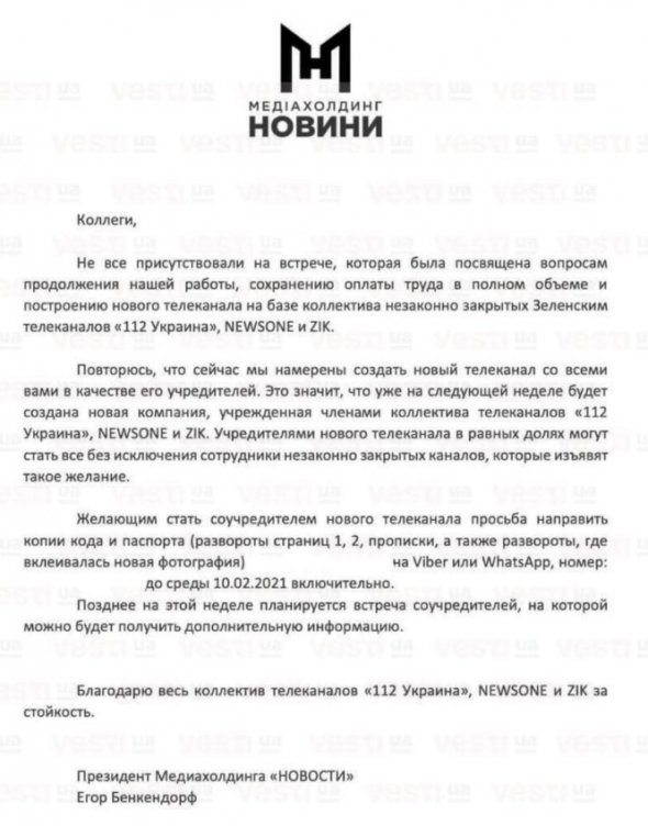 "Повторюся, що зараз ми маємо намір створити новий телеканал з усіма вами в якості його засновників. Це означає, що вже на наступному тижні буде створена нова компанія, заснована членами колективу телеканалів "112 Україна", "NewsOne" і "ZIK". Засновниками нового телеканалу в рівних частках можуть стати всі без винятку працівники незаконно закритих каналів, які виявлять таке бажання", - говориться в повідомленні.