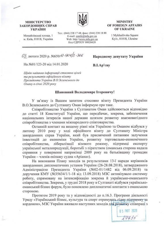 "Віддуватися, видно, доручили МЗС. Звідти надіслали кілька сторінок виправдань, прочитавши які, складається враження, що ми інтегруємось не в ЄС і НАТО, а в Оман. Взаємини з цією державою – чи не №1 системний зовнішньополітичний пріоритет для України", – зазначила депутат.