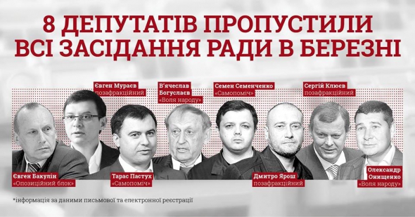 Серед нардепів, які не відвідали жодне засідання у березні - Семен Семенченко і Тарас Пастух із "Самопомочі", Євген Бакулін із "Опозиційного блоку", Вячеслав Богуслаєв з групи "Воля народу", а також позафракційні Євгеній Мураєв і Дмитро Ярош.
