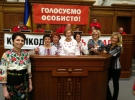 Зараз у сесійній залі знаходиться близько 100 опозиціонерів. Більшість депутатів від "Батьківщини" та "Свободи" вдягнуті у вишиванки, а "ударівці" у червоних светрах "Голосуємо особисто!".