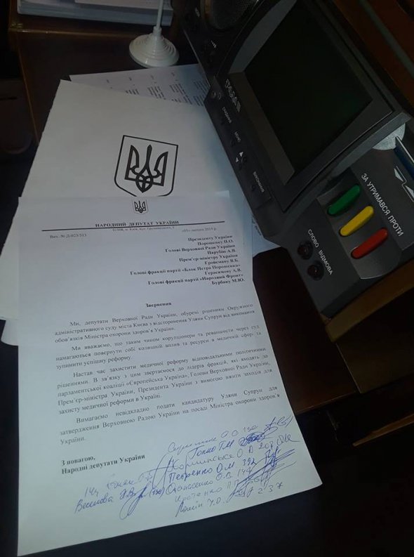 Народні депутати збирають підписи за призначення відстороненої в.о. міністра охорони здоров'я Уляни Супрун на посаду керівника МОЗ.
