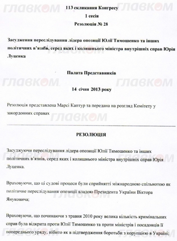 14 січня 2013 року конгресмен від демократичної партії, співголова групи підтримки України в Конгресі Марсі Каптур представила на розгляд комітету у закордонних справах Палати представників проект резолюції про ситуацію з політичними репресіями в Україні.