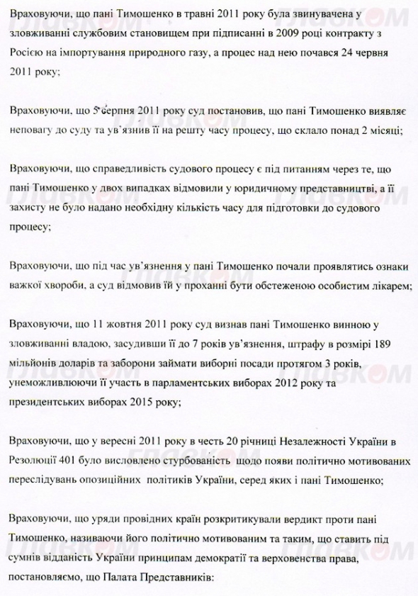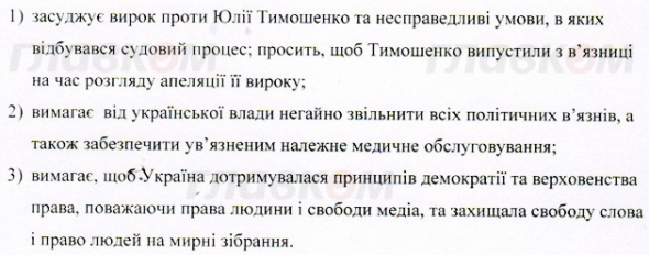 У документі визнається наявність політичних в'язнів в Україні і висувається вимога до українського уряду негайно звільнити всіх політичних ув'язнених. Насправді, представлений проект трохи м'якший, ніж прийнята восени минулого року резолюція Сенату Конгресу США.