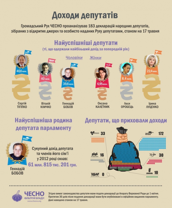 Протягом 2012 року щонайменше 44 парламентаря отримали дохід більше 1 мільйона гривень, а ще у 15 депутатів сукупний річний дохід сім'ї перевищує мільйон гривень.