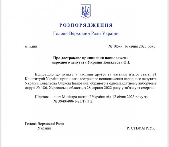 "Доля колаборантів та зрадників України. Підписав розпорядження про дострокове припинення повноважень нардепа Ковальова. У зв'язку зі смертю", ‒ написав Стефанчук у Twitter.