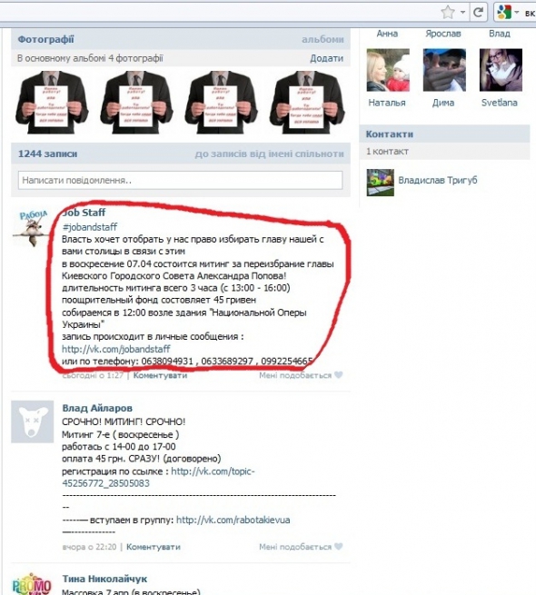 Так, в соціальних мережах, зокрема, ВКонтакті, зявилася інформація для любителів заробити на мітингах: в спільноті Работа в Киеве на лето, на выборах, митинги, палатки користувач Job Staff вивісив на стіні текст наступного змісту: