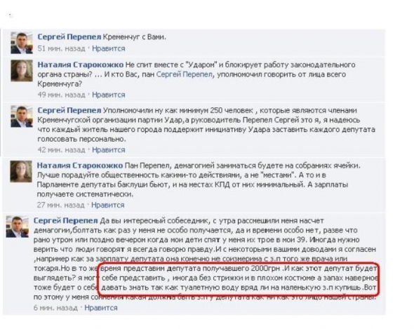 "С некоторыми вашими доводами я согласен ,например как за зарплату депутата она конечно не соизмерима с з.п того же врача или токаря.Но в то же время представим депутата получавшего 2000грн .И как этот депутат будет выглядеть? я могу себе представить , иногда без стрижки и в плохом костюме а запах наверное тоже будет о себе давать знать так как туалетную воду вряд ли на маленькую з.п купишь.Вот по этому у меня сомнения какая должна быть з.п у депутата как ни как это лицо нашей страны", – написав він.