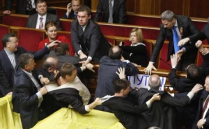 У сесійнім залі у вівторок, 27 квітня, на місцях депутатів від БЮТ і НУ-НС розстелений український стяг із написом "Не дамо продати Україну! Державній зраді – ні!".