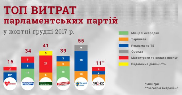 Із вересня 2016 року до вересня 2017-го партії сукупно витратили 436 млн грн, із яких 407 млн склали кошти держбюджету. Найбільше грошей - 109 млн - партії витратили на рекламу на телебаченні, радіо, в друкованих ЗМІ, білбордах.
