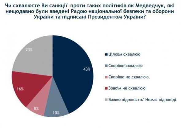Цілком схвалюють санкції РНБО проти Медведчука 43% респондентів, свідчать дані опитування соціологічної групи "Рейтинг". Іще 10% - радше схвалюють, тоді як 8% опитаних скоріше не схвалюють санкції. Зовсім не схвалюють їх 16% українців. 23% заявили, що їм важко відповісти на таке питання.