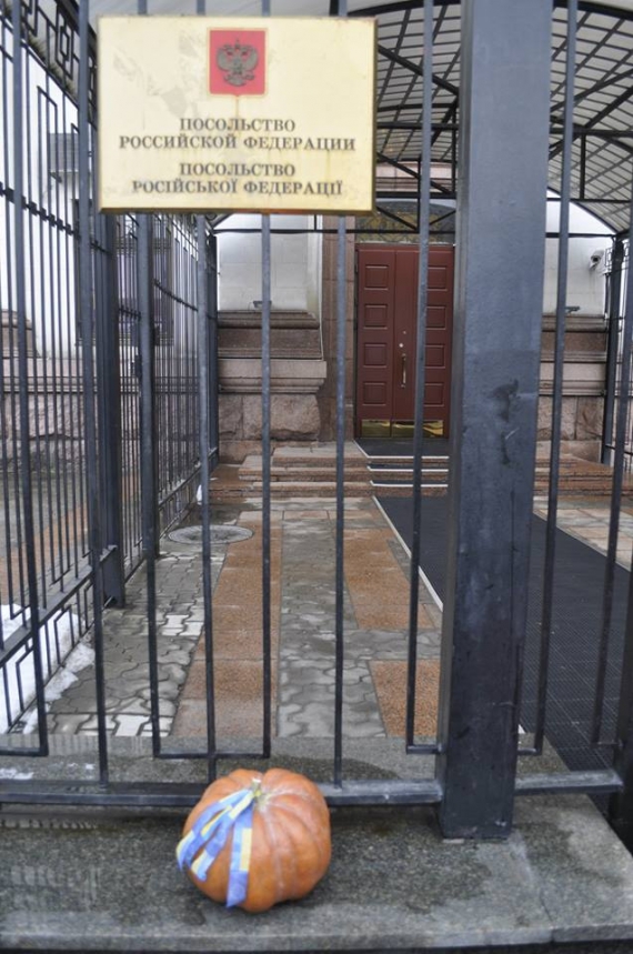 Близько 50 дівчат провели пікетування Посольства РФ, заспівали там народних пісень та залишили там свою однозначну відмову вступати до Митного Союзу - гарбуз, об'вязаний єврострічками.