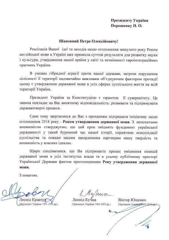Президенти Леонід Кравчук, Леонід Кучма та Віктор Ющенко звернулися до нинішнього глави держави Петра Порошенка з проханням оголосити 2018-й Роком утвердження державної мови.