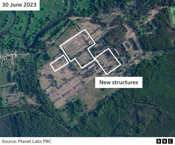 Видання BBC Verify отримало останні супутникові знімки території колишньої ВЧ №61732 у с. Ціль (Осиповицький р-н, Могильовська обл.) за 30 червня 2023 року. На кадрах чітко видно, що будівництво польового табору завершено, пише моніторингова група "Беларускі Гаюн".