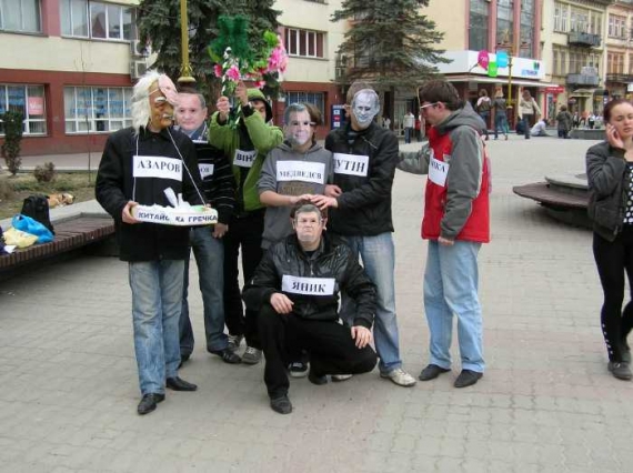 На центральній площі міста одягнені в маски українських і закордонних політиків молоді люди демонстрували політичну клоунаду: Микола Азаров роздавав китайську гречку, Віктора Януковича переслідував вінок, Анатолій Могильов і Віктор Пшонка пильнували за порядком…