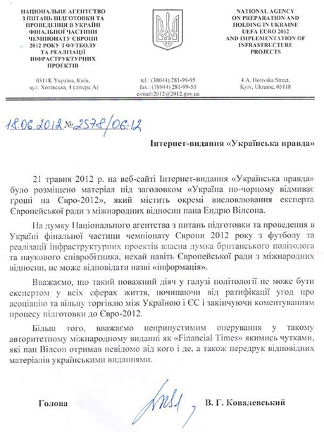 Національне агентство з питань підготовки та проведення фінальної частини Євро-2012 в Україні вважає неприпустимим те, що "Українська правда" передрукувала матеріал з газети Financial Times за підписом експерта Ендрю Вілсона.
