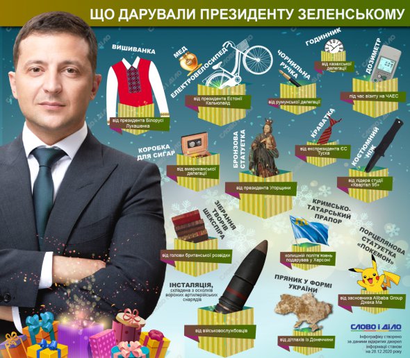 Під час поїздки на Чорнобильську АЕС президенту подарували дозиметр. На початку 2020-го діти з селища Новгородське Донецької області надіслали пряник у формі України.