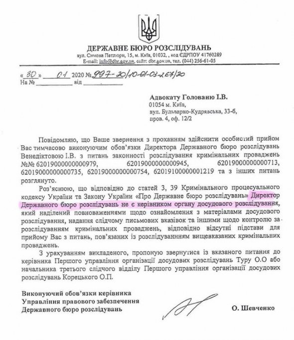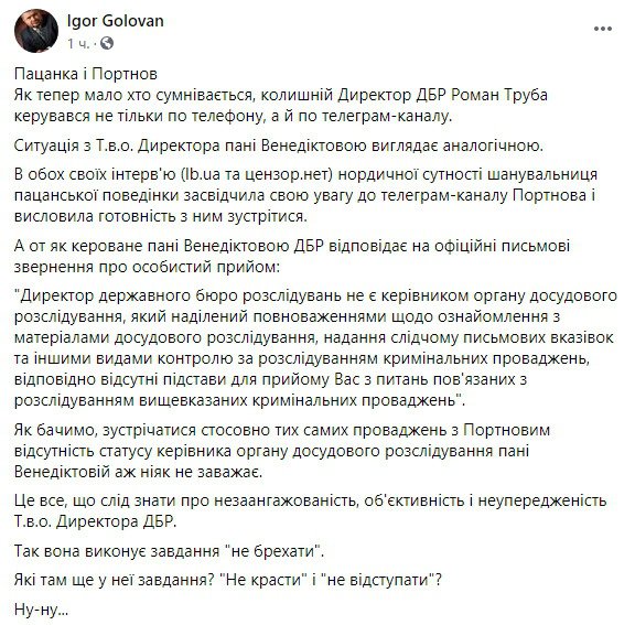"А от як кероване пані Венедіктовою ДБР відповідає на офіційні письмові звернення про особистий прийом: "Директор Державного бюро розслідувань не є керівником органу досудового розслідування, який наділений повноваженнями щодо ознайомлення з матеріалами досудового розслідування, надання слідчому письмових вказівок та іншими видами контролю за розслідуванням кримінальних проваджень, відповідно відсутні підстави для прийому Вас з питань пов'язаних з розслідуванням вищевказаних кримінальних проваджень"", - розповів Головань.